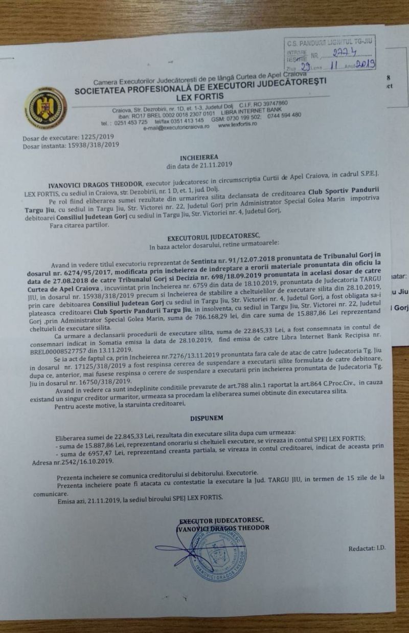 Clubul continuă acțiunile de executare silită a acționarilor săi și chiar în preajma luării deciziei de intrare în faliment reprezentanții acestuia reușiseră să obțină încă o sentință prin care să execute Consiliul Județean Gorj, de exemplu. Pe 21 noiembrie Consiliul Județean a fost notificat de executorul Dragoș Theodor Ivanovici că a fost dispusă eliberarea a aproape 23.000 de lei din conturile CJ Gorj. Cea mai mare parte din suma respectivă, aproape 16.000 de lei merg spre executorul judecătoresc, în timp ce restul de 7.000 de lei „se virează în contul creditoarei”. Pe rolul instanțelor echipa are mai multe procese cu acționarii săi pentru a-și recupera cele circa trei milioane de euro dispuse în toamnă pentru a fi plătite de cei care s-au angajat că finanțează activitatea clubului. Sentința care îi obliga pe acționari la plata celor trei milioane a fost contestată, dosarul fiind înregistrat oficial de la mijlocul lunii trecute pe rolul Înaltei Curți de Casație și Justiție, până la luarea unei decizii finale mai fiind de așteptat vreo câteva luni.