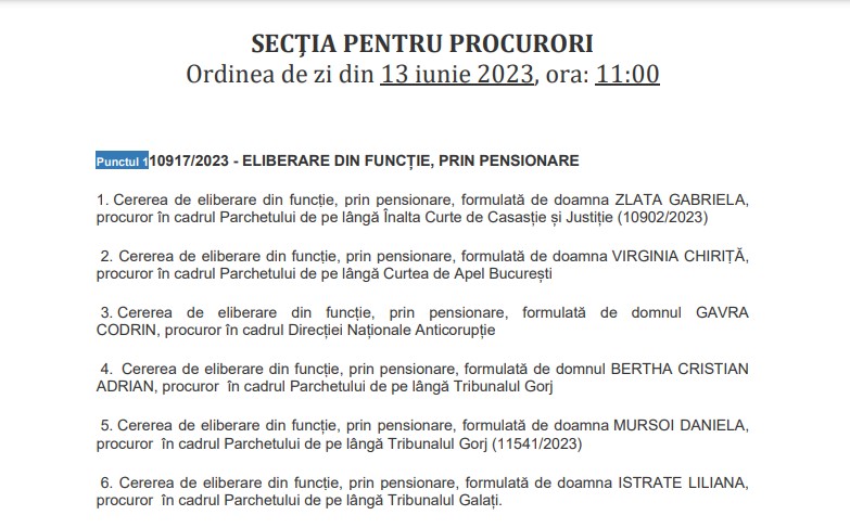 Cererea de eliberare din funcție, prin pensionare, formulată de doamna MURSOI DANIELA, procuror în cadrul Parchetului de pe lângă Tribunalul Gorj”, se află pe ordinea de zi a CSM de marți, 13 iunie.