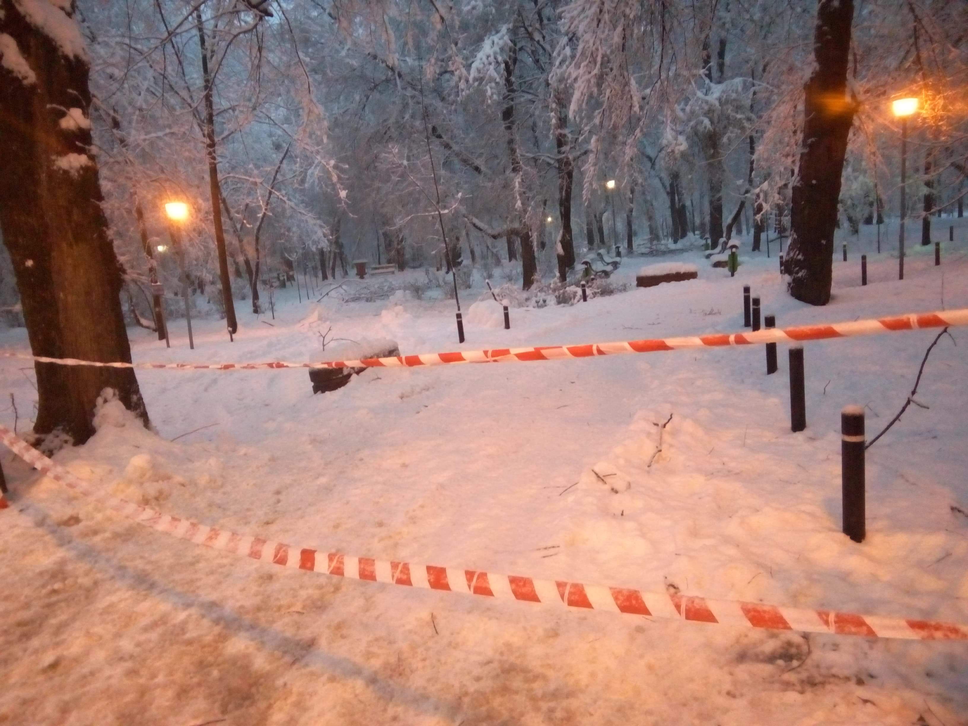 Parcul Central din Târgu-Jiu a fost închis în cursul nopții trecute, aleile fiind pline de zăpadă în timp ce mai mulți arbori s-au rupt sub greutatea ninsorii.