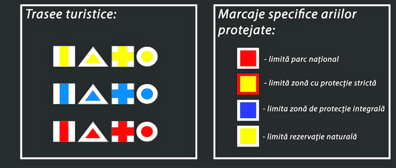 Marcajele specifice ariilor naturale protejate sunt diferite de cele specifice traseelor turistice.