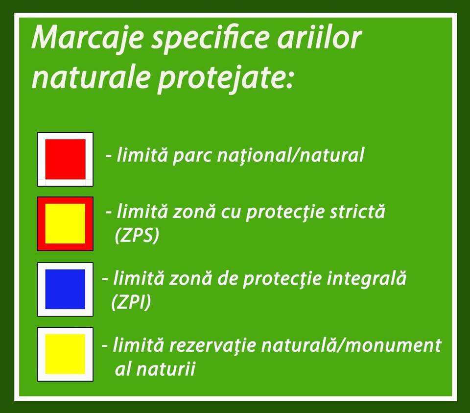 Potrivit Romsilva, semnele prin care vor fi stabilite limitele parcurilor naţionale şi ale parcurilor naturale vor fi reprezentate după cum urmează: astfel: pentru Zona cu protecţie strictă (ZPS) – un pătrat galben, înconjurat de o bandă roşie; pentru Zona de protecţie integrală (ZPI) – un pătrat albastru, înconjurat de o bandă albă; pentru Rezervaţie naturală/monument al naturii – un pătrat galben, înconjurat de o bandă albă.
