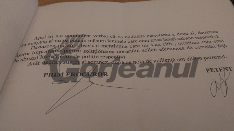În loc să cerceteze faptele, cei doi polițiști i-au dat timpul necesar primarului de Văgiulești să-și acopere urmele și chiar să vândă lemnele sustrase din pădure, potrivit reclamantului. Ambii polițiști s-au deplasat la fața locului în noaptea de 20 noiembrie 2016 au întocmit proces verbal în care au consemnat că ,,s-au deplasat de la cioata de arbori, pe urma lăsată de tragerea armelor târâș până la cabana numitului Pîrjol Constantin, unde acesta nu a permis cercetarea”. Cel puțin asta a consemnat primul procuror în aprilie după discuția cu reclamantul, dar, din păcate, la o jumătate de an după audiență, dosarul se află în aceeași stare, la Parchetul de pe lângă Judecătoria Motru.