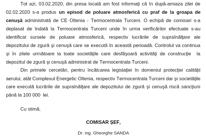 ,,Azi, 3 februarie 2020, din presa locală am fost informați că în după-amiaza de 2 februarie 2020 s-a produs un episod de poluare atmosferică cu praf de la groapa de cenușă administrată de CE Oltenia -Termocentrala Turceni. O echipă de comisari s-a deplasat de îndată la Termocentrala Turceni, unde, în urma verificărilor efectuate s-au identificat sursele de poluare atmosferică, respectiv lucrările de supraînălțare ale depozitului de zgură și cenușă care se execută în această perioadă.