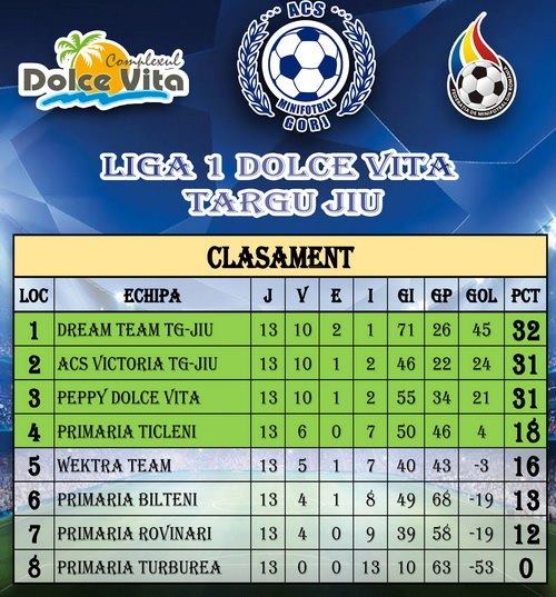 Dream Team și ACS Victoria au remizat în derby-ul etapei a 13-a din Liga 1 Dolce Vita la minifotbal. Cele două formaţii s-au întâlnit în penultima etapă a sezonului regulat.Meciul a stat sub semnul echilibrului, golul lui Ștefan Doldur fiind anulat de reușita lui Luis Scurtu. Egalul a avantajat formaţia Peppy Dolce Vita, care acum este la egalitate de puncte cu ACS Victoria, şi la un singur punct de liderul Dream Team.