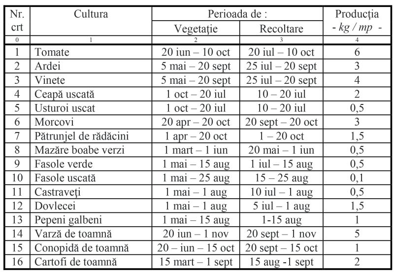 Aceste date vă sunt de folos în a stabili suprafața pe care veți cultiva legume, după ce ați calculat nevoile familiei și / sau pe cele pentru comercializare.