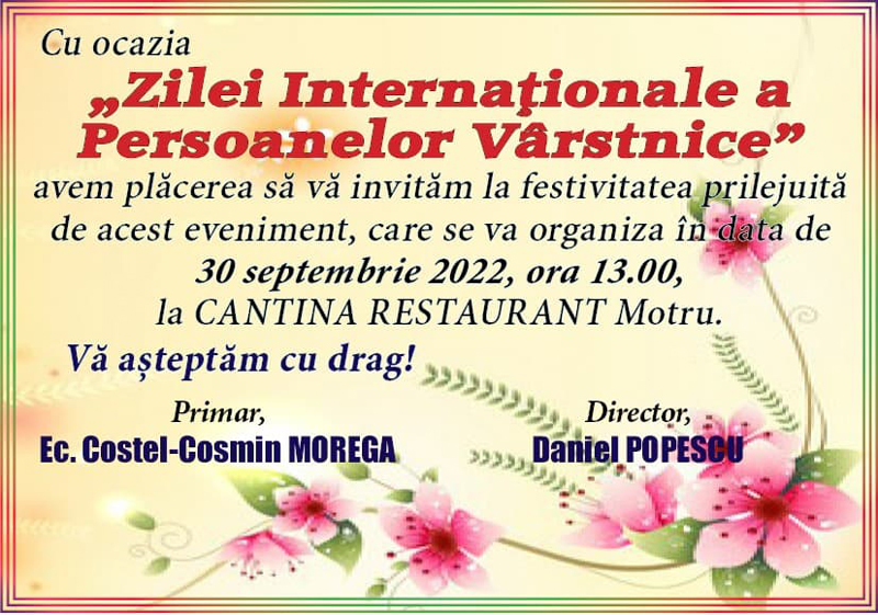 În jur de 400 de pensionari din Motru vor participa, la finalul acestei luni, la manifestările organizate de autoritatea municipală cu ocazie zilei persoanelor vârstnice. Pe 28 septembrie, cu un mic avans față de Ziua Internațională a Persoanelor Vârstnice, un grup de 60 de pensionarii vor merge într-o excursie la o mănăstire din zonă. Pe data de 30 septembrie, în jur de 400 de persoane vor fi invitate la o masa festivă, la Cantina Restaurant Motru. Între aceste zile, vor fi organizate concursuri de șah și table.