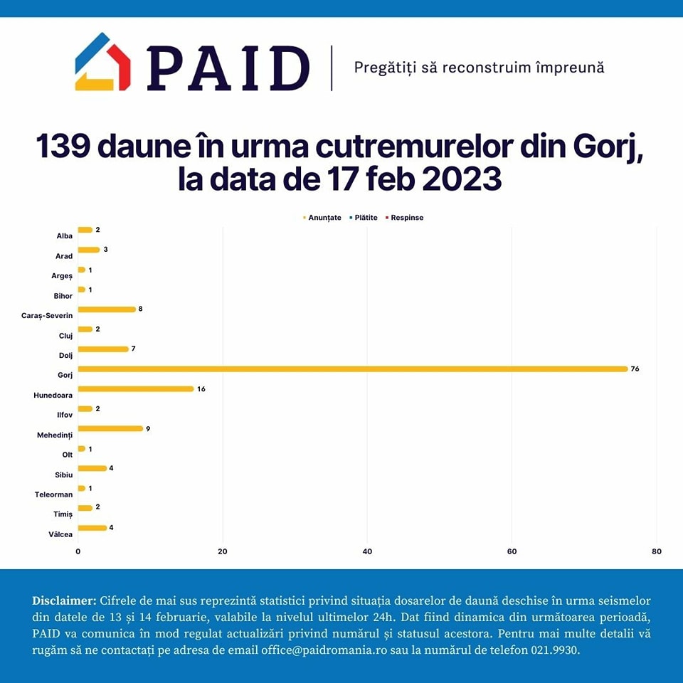Până la data de 17 februarie s-au deschis 139 de dosare de despăgubiri privind polițele de asigurare obligatorii în 16 județe, a anunțat PAID (Pool-ul de Asigurare Împotriva Dezastrelor), societatea privată de asigurări care emite polițele PAD de asigurare obligatorie a locuințelor și plătește despăgubirile în caz de dezastre.