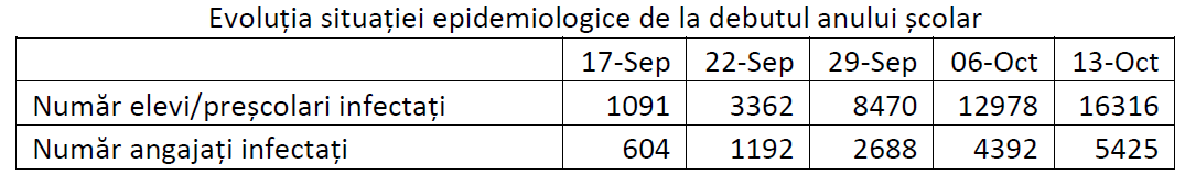 Conform informațiilor centralizate pe baza raportărilor din unitățile de învățământ preuniversitar, 16.316 preșcolari și elevi și 5.425 de angajați din învățământ au fost confirmați cu COVID-19 până la această dată, anunță Ministerul Educației.