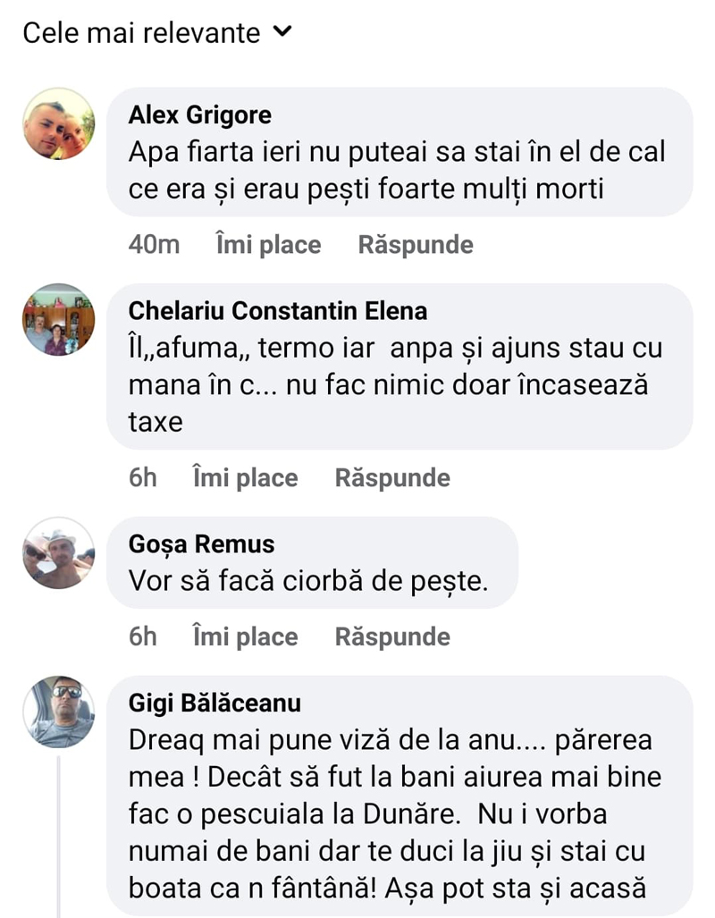 Sunt numeroase astfel de comentarii, unii dau vina pe reprezentanții termo, alții de asociațiile și instituțiile care ar trebui sa ia măsuri și să îi tragă la răspundere pe cei vinovați. Cert este că cineva trebuie să răspundă pentru cantitatea mare de peste mort e Jiu, iar Garda de Mediu Gorj ar trebui să cerceteze acest incident de mediu.
