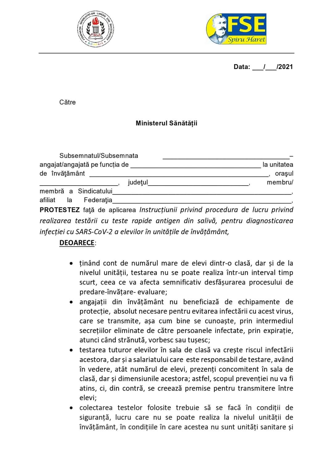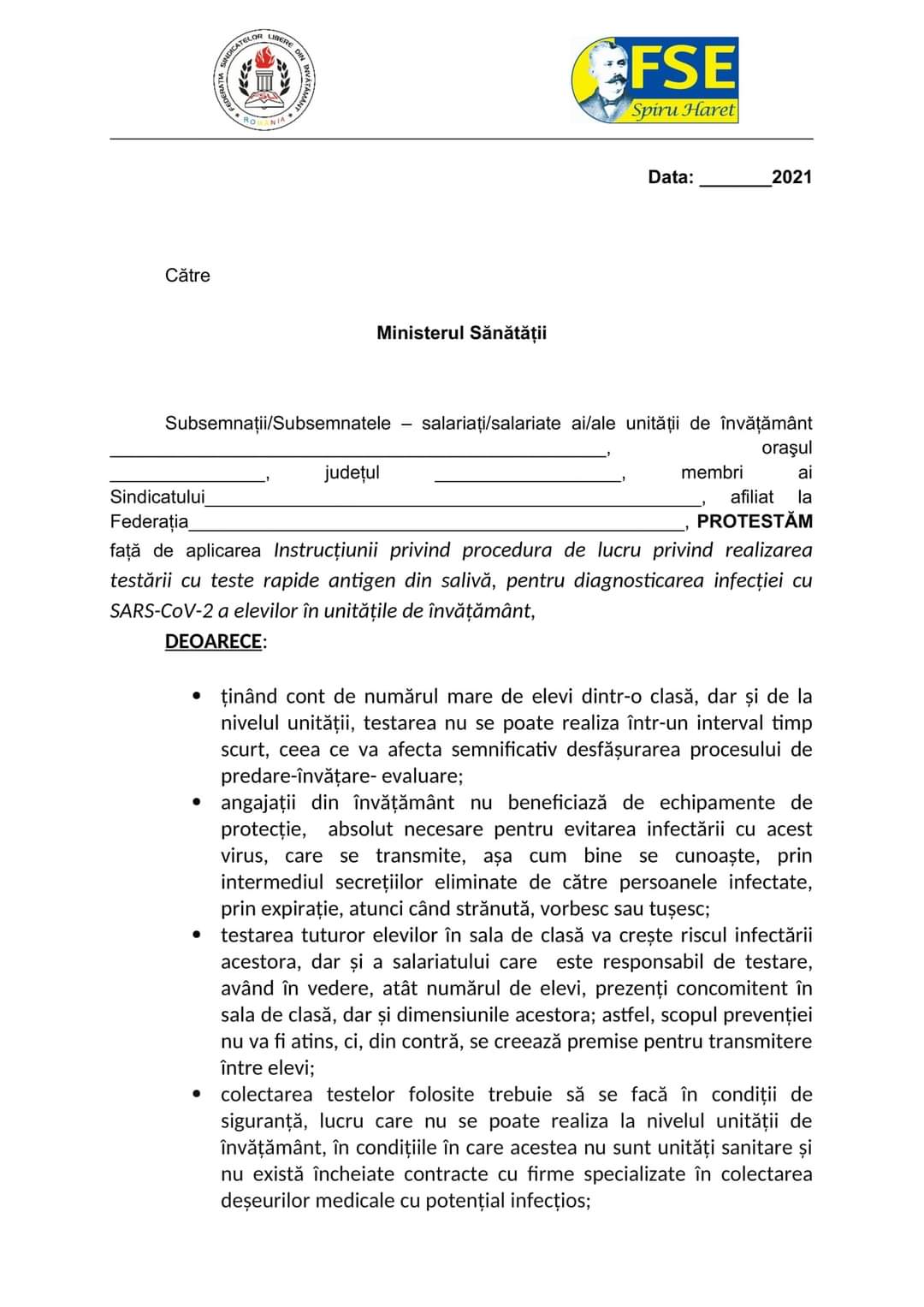 Federația Sindicatelor Libere din Învățământ și Federația Sindicatelor din Educație „Spiru Haret” au lansat o petiție prin care protestează faţă de aplicarea Instrucțiunii privind procedura de lucru privind realizarea testării cu teste rapide antigen din salivă, pentru diagnosticarea infecției cu SARS-CoV-2 a elevilor în unitățile de învățământ și solicită modificarea acesteia.