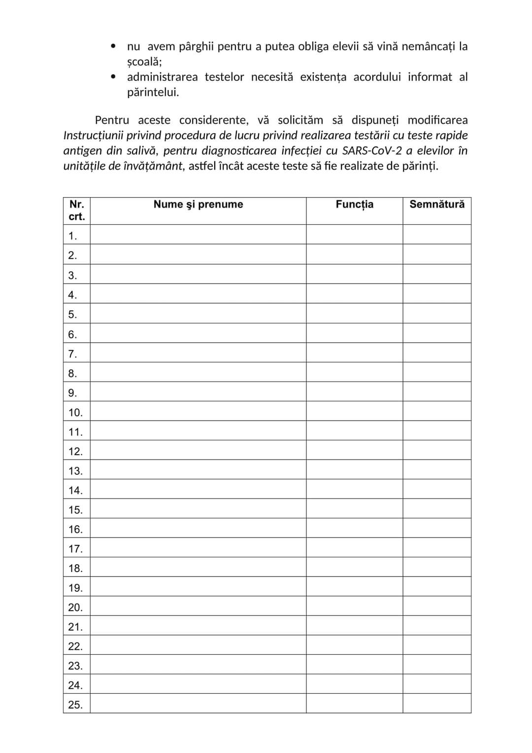 Pentru aceste considerente, vă solicităm să dispuneți modificarea Instrucțiunii privind procedura de lucru privind realizarea testării cu teste rapide antigen din salivă, pentru diagnosticarea infecției cu SARS-CoV-2 a elevilor în unitățile de învățământ, astfel încât aceste teste să fie realizate de părinți”, se arată în petiție. „Petiția semnată de membri se va trimite pe adresa de email: ministru@ms.ro și relații.publice@ms.ro”, mai transmit reprezentanții celor două federații.