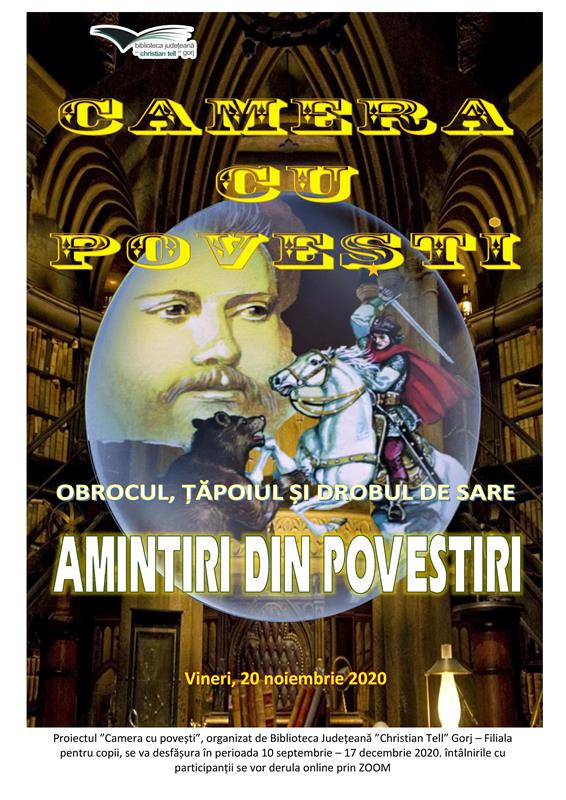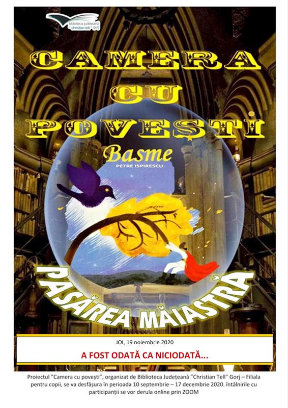 Proiectul ,,Camera cu povești” a debutat în luna septembrie, iar de atunci, aproape în fiecare săptămână, grupuri de elevi au participat la întâlniri online, organizate pe Zoom, în cadrul cărora s-au discutat cărți îndrăgite de copii, s-au organizat concursuri de cunoștințe generale sau de elucidare a unor imagini distorsionate, sub îndrumarea coordonatorilor proiectului, Luiza Sandu, Cosmin Văcaru și Lucian Dobroiu. Săptămâna aceasta sunt programate două astfel de întâlniri, ce se vor desfășura joi, 19 noiembrie, și vineri, 20 noiembrie. Tema întâlnirii de joi va fi „Pasărea măiastră”, de Petre Ispirescu, iar vineri elevii vor vorbi despre o altă cunoscută povestire semnată de Ion Creangă, ,,Prostia omenească”. Proiectul ,,Camera cu povești” se va derula până pe 17 decembrie 2020.