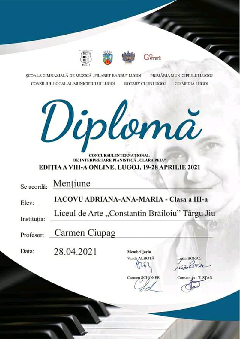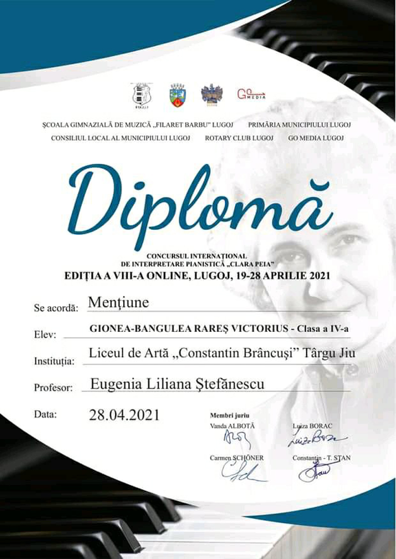 Au mai obținut mențiuni la concursul ,,Clara Peia”, următorii tineri pianiști: Mitroi Karina-Andreea, clasa I, și Gionea-Banculea Rareș-Victorius, clasa a IV-a, ambii având-o ca profesor coordonator pe doamna Eugenia-Liliana Ștefănescu, și Iacovu Adriana Ana-Maria, clasa a III-a, profesor Carmen Ciupag.