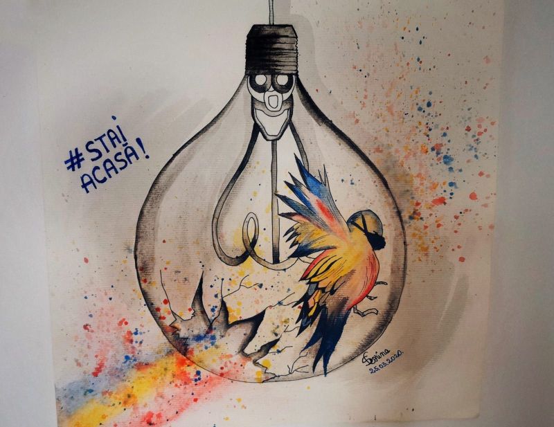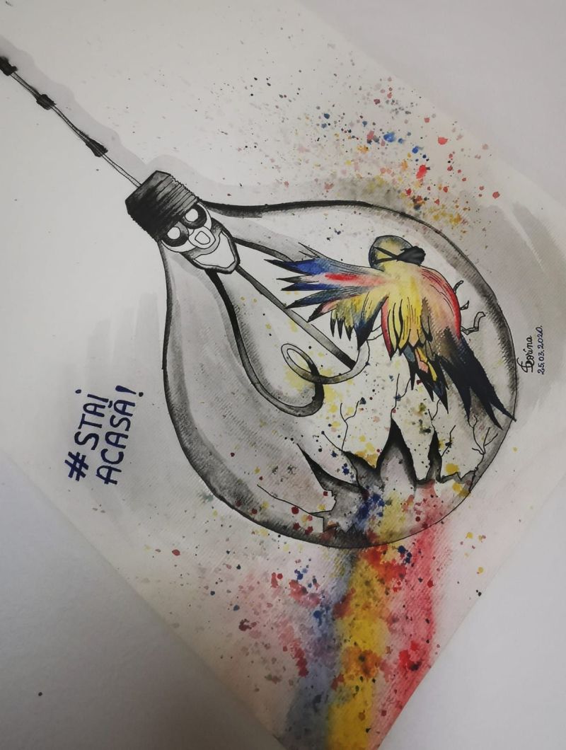 Tânăra de 21 de ani, agent în cadrul Compartimentului de Proximitate al Biroului de Ordine Publică din cadrul Poliției Municipiului Târgu-Jiu, a realizat o pictură în care le arată oamenilor cât de important este să stea acasă, pentru prevenirea răspândirii infectării cu noul tip de coronavirus. Corina a explicat că pasărea aflată într-un bec reprezintă boala.