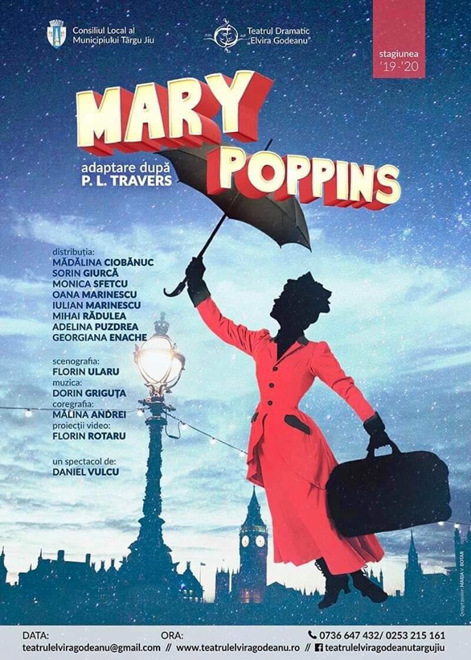 Duminică, 8 septembrie, Teatrul Dramatic ”Elvira Godeanu” din Târgu Jiu deschide stagiunea 2019/2020 cu piesa „Mary Poppins”, după P.L. Travers, un spectacol de Daniel Vulcu.