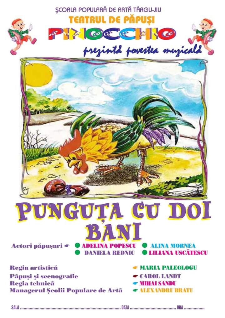 Școala Populară de Arte „Constantin Brâncuși” Târgu Jiu a anunțat că piesa ”Punguța cu doi bani”, ce urma să fie pusă în scenă duminică, 04.10.2020, începând cu ora 10:00, va fi reprogramată, iar data va fi comunicată în curând.