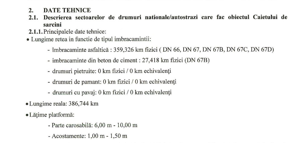 „Execuție lucrări de întreținere curentă – parte carosabilă, acostamente, benzi de urgență și benzi de încadrare anul I – IV – DRDP Craiova: Lot 1 SDN Craiova, Lot 2 SDN Tr. Severin, Lot 3 SDN Tg. Jiu, Lot 4 SDN Rm. Vâlcea, Lot 5 SDN Slatina”, se arată în caietul de sarcini al licitației.