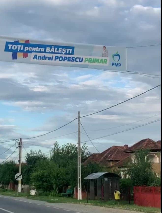 Pe raza comunei Bălești a apărut astăzi un banner care le indică cetățenilor, cu două luni înainte de scrutin, să voteze candidatul PMP la fotoliul de primar. Mai exact pe un consilier local cu două mandate care a fost patru ani cu PDL și alți patru cu ALDE.