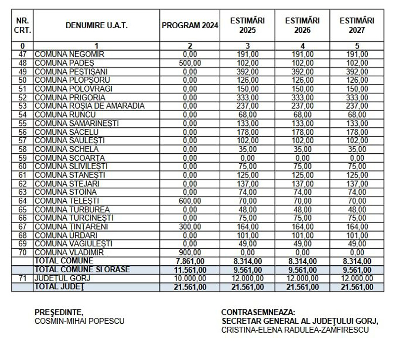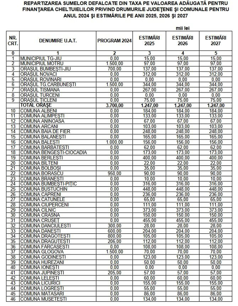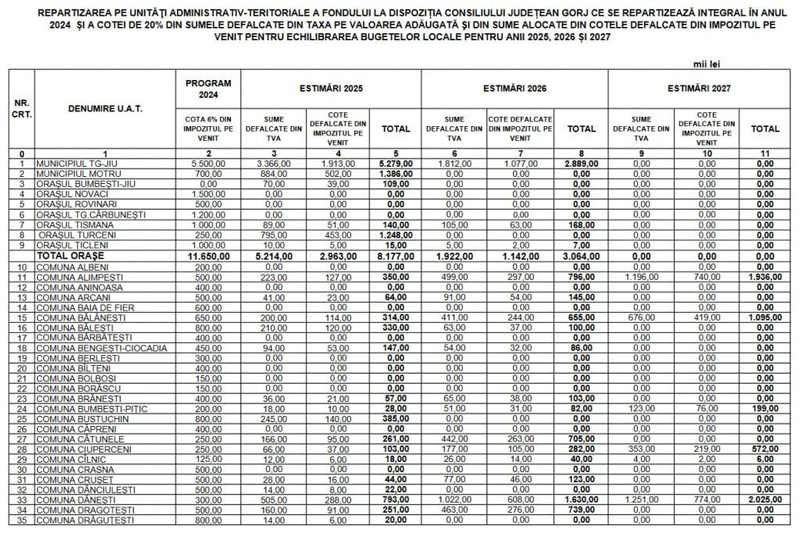 CJ Gorj a votat ieri hotărârea privind împărțirea banilor către primăriile din județ, adică sumele defalcate din taxa pe valoare adăugată pentru finanțarea cheltuielilor privind drumurile judeţene şi comunale pentru anul 2024 şi estimările pe anii 2025-2027, precum și cota de 20% din sumele defalcate din taxa pe valoarea adăugată pentru echilibrarea bugetelor locale şi a sumelor alocate din cotele defalcate din impozitul pe venit pentru echilibrarea bugetelor locale pentru anii 2025, 2026 și 2027, după cum a precizat instituția.