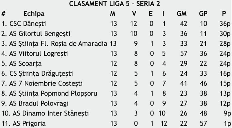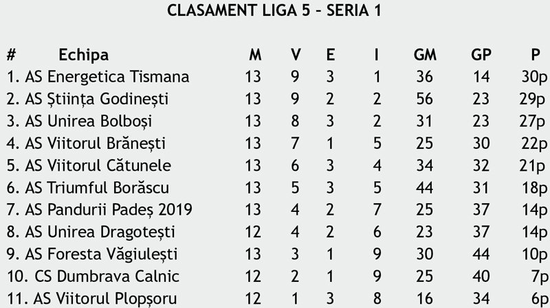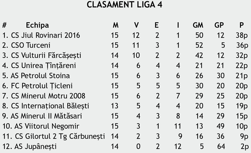 Etapă bună pentru favorite în Liga 4 din Gorj. Primele trei echipe s-au impus în meciurile din weekend, iar Jiul Rovinari se menține lider. Pe de altă parte, Viitorul Negomir a reușit un nou succes, după ce a învins campioana în exercițiu, de această dată într-o deplasare grea, la Țînțăreni. În Seria 1 a Ligii 5, Energetica Tismana a preluat conducerea clasamentului după etapa cu numărul 14. În schimb, în Seria 2, formația din Dănești își menține avansul de 6 puncte în fruntea plutonului.