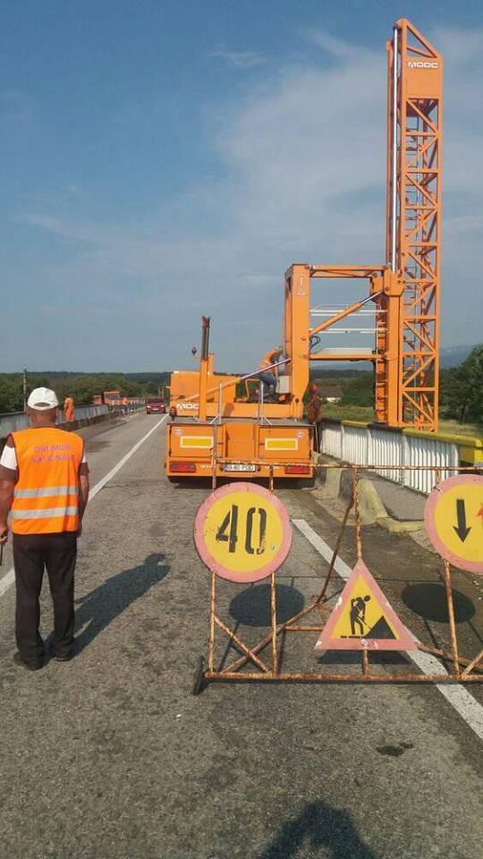 Angajații Secției Drumuri Naționale (SDN) Târgu-Jiu acționează, cu un utilaj complex, în zona podurilor din județul Gorj. Astfel de revizii se fac pentru a fi preîntâmpinate eventuale accidente.