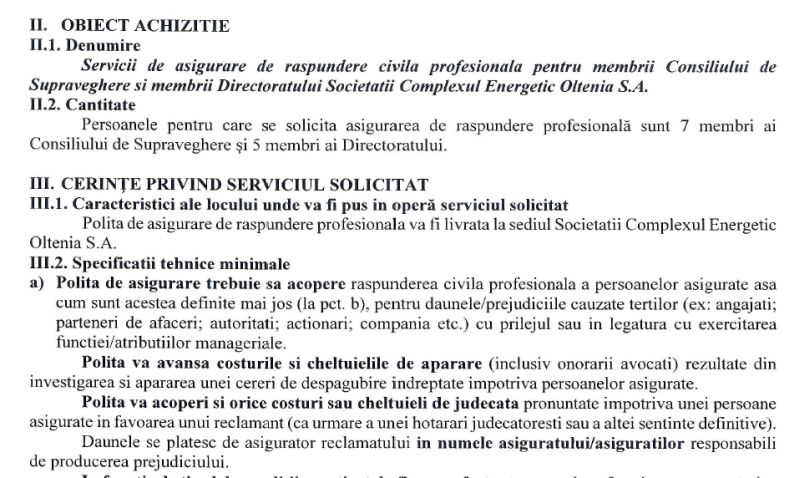 Complexul Energetic Oltenia organizează o procedură simplificată pentru achiziţionarea de servicii de asigurare de răspundere civilă profesională pentru toţi membrii Consiliului de Supraveghere și ai Directoratului. În total este vorba despre 12 persoane, poliţa de asigurare având o valoare de 20 de milioane de euro.