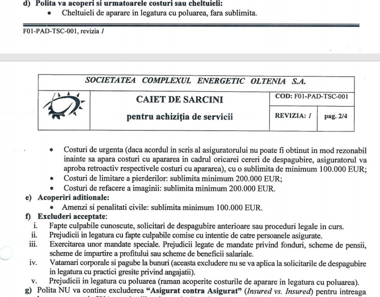 Complexul Energetic Oltenia caută o firmă de asigurare pentru achiziția unei polițe de asigurare de răspundere civilă profesională pentru șefii companiei. Sunt vizați membrii Consiliului de Supraveghere și ai Directoratului. Suma pusă la bătaie trece de 120.000 de lei.