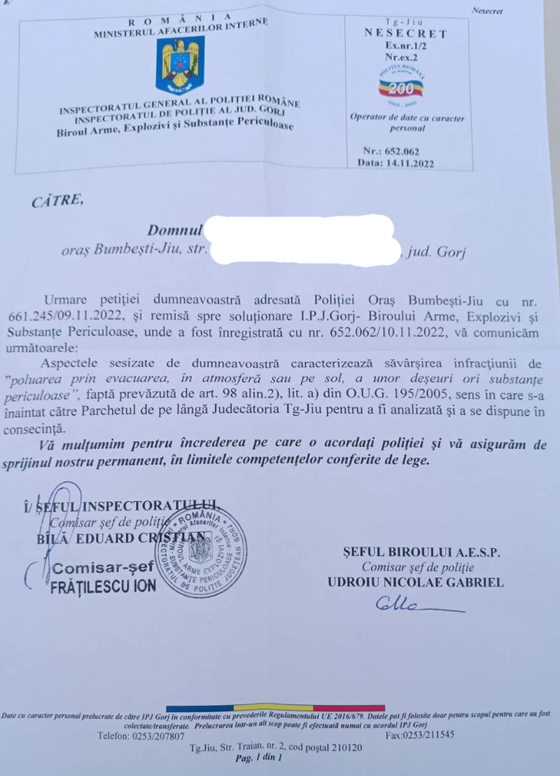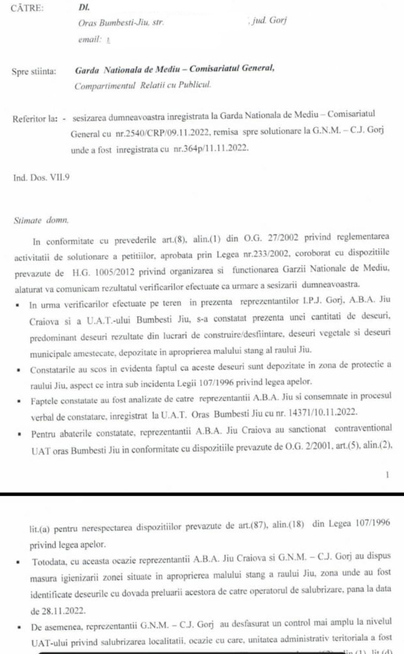 Un lucru benefic a fost că autoritățile de mediu, ABA Jiu și Garda de Mediu Gorj au intervenit, la sesizarea cetățenilor, și au sancționat primăria, impunând UAT-ului să facă