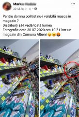 Un agent de la Secţia Poliţie Rurală Târgu-Cărbuneşti a fost amendat cu 500 de lei, după ce a fost fotografiat într-un magazin din comuna Albeni, fără mască.
