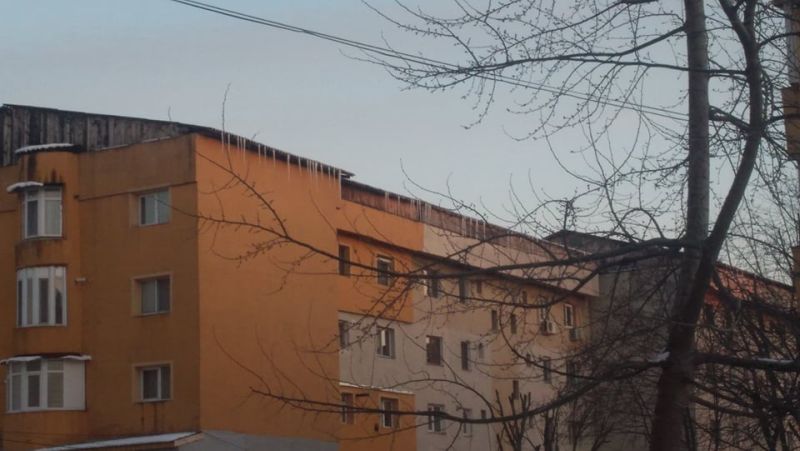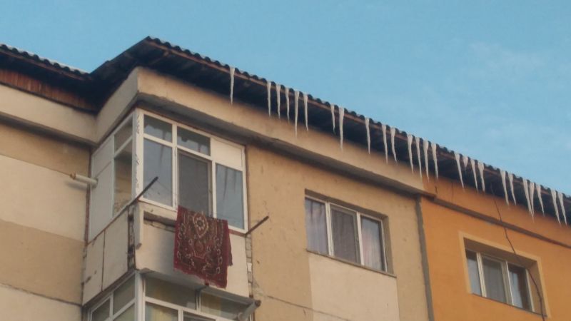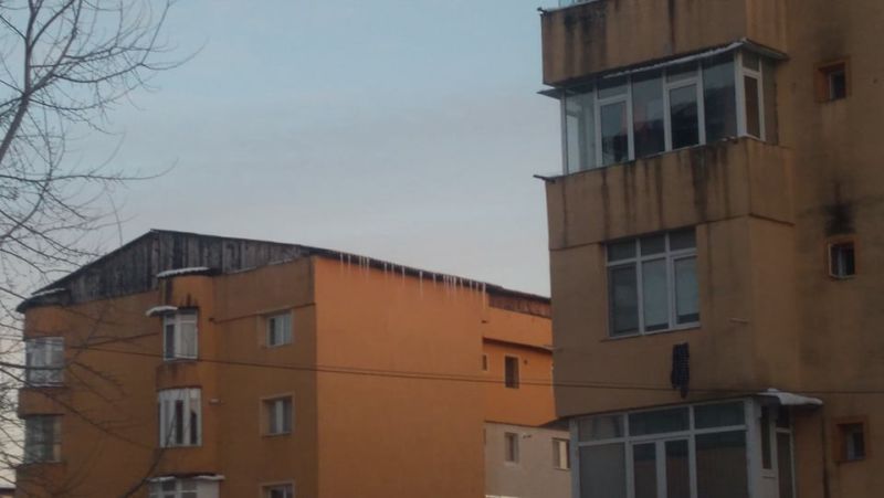 Cetățenii din zona 9 Mai au atenționat că pericolul vine de sus, arătând spre țurțurii de gheață, care stau să cadă la intrările în bloc.