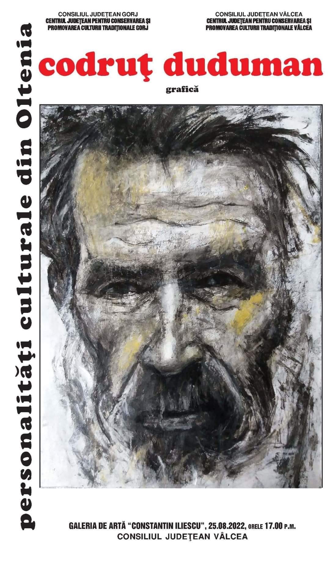 Centrul Județean pentru Conservarea și Promovarea Culturii Tradiționale Gorj organizează joi, 25 august, începând cu ora 17.00, la sala “Constantin Iliescu” a Consiliului Județean Vâlcea, expoziția cu portrete semnată de artistul Codruț Duduman. Evenimentul este organizat în parteneriat cu Centrul Județean pentru Conservarea și Promovarea Culturii Tradiționale Vâlcea.