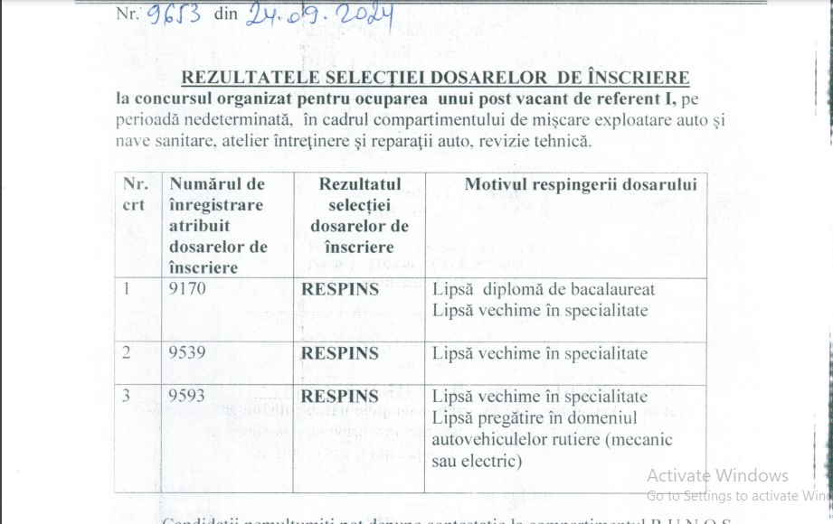 Niciunul dintre candidați nu a putut dovedi, cu acte, vechimea în specialitatea postului. Unul dintre ei nu a adus nici măcar diploma de bacalaureat, iar un altul nu avea pregătirea necesară pentru ocuparea postului. În aceste condiții, cei trei candidați au fost declarați respinși. Proba scrisă era programată pentru data de 30 septembrie.