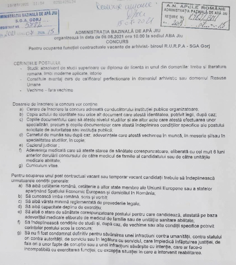 Pe site-ul ABA Jiu, acum câteva zile, postul vacant de la SGA Gorj nu figura. Conducerea SGA Gorj a afișat, în schimb, condițiile de concurs și bibliografia în incinta unității, unde nu poți intra decât anunțat și ești văzut pe camera de supraveghere.