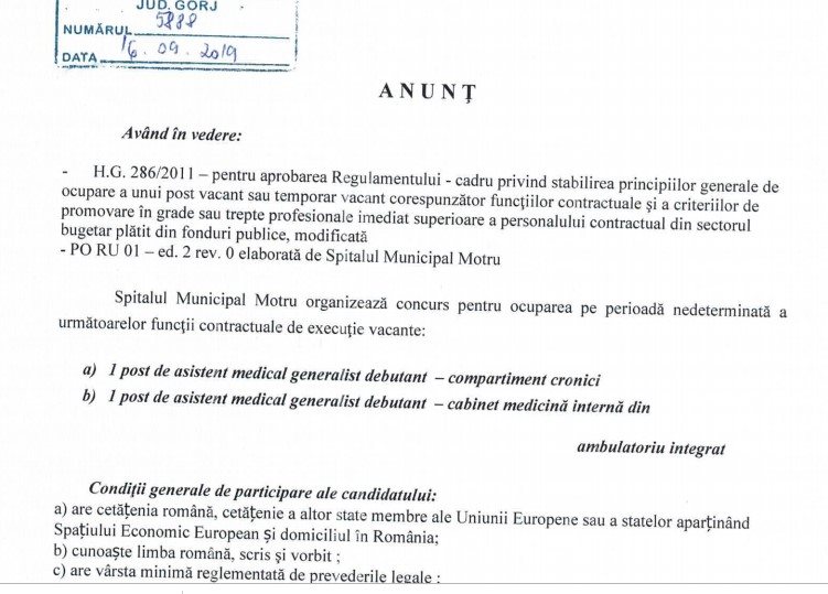 Spitalul Municipal Motru a scos la concurs trei posturi de asistent medical generalist debutant. Două dintre ele sunt vacante în ambulatoriul integrat al spitalului, la cabinetele de medicină internă și pediatrie, iar un altul la Compartimentul cronici. Posturile nu necesită vechime, doar diplomă de bacalaureat și de absolvire a unei școli sanitare postliceale.
