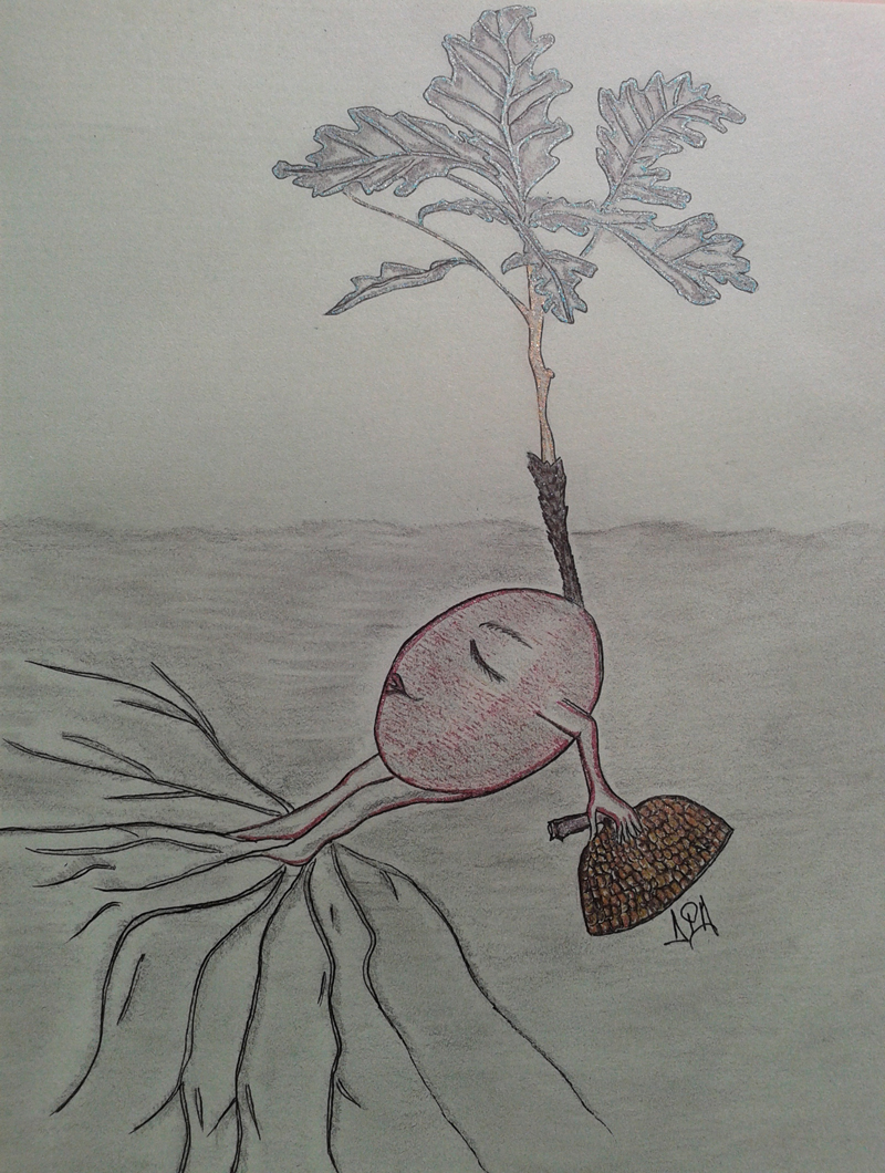 Ghindișor, eroina noastră, căzu ceva mai depărticel… îi plăcu călătoria scurtă prin aer… ajunsă pe sol, simți cald și umed. ,,EEEE!… Frumos și pe-aici”, șopti ea… ,,dar parcă mai frumos era agățată. Puteam vedea departe taaare”, gândi ea… Până să reflecteze la schimbare, se auzi un foșnet… apoi pași îndesați și grohăituri. ,,Ce o fi asta?”, se miră Ghindișor, însă nu-i trebui mult să se lămurească… Mistreți, care se apucară să mănânce cu poftă ghinduțele… ,,Ooo! Trebuie să mă ascund din calea lacomilor acestora…“, se îngrijoră ea. Norocul o ajută… unul dintre mistreți, foșnind cu râtul printre frunze și ghinde, o împinse fără să vrea… Ghindișor se rostogoli și ajunse într-o adâncitură, sub niște frunze uscate. Stătu acolo, pitită… Mistreții, sătui, plecară… Veniră și alte animale: urși, cerbi și nelipsitele veverițe. Toți râvneau la fructele maronii-gălbui. Începură ploile… Apoi se așternu, rece, zăpada… Ghindișor se afundase mult… și… se pregăti să-și preschimbe visul în realitate. După aproape un an, un stejărel privea semeț lumea pe care avea s-o cucerească! Avea doar câteva frunze, însă multe visuri! Vor trece mulți ani și multe anotimpuri… Va fi încercat: de vreme, de dăunători… însă va avea o șansă: aceea de a deveni, peste timp, un stejar falnic – precum bunicul său, Bătrânul Stejar… Va trăi și va vedea multe… Va avea propriile fructe… Își va împlini menirea – aceea de a preda ștafeta noilor generații… Pădurea își va spori vechiul cu noul… trecutul se va fi împletit cu viitorul… totul pornind de la un sâmbure de viață!