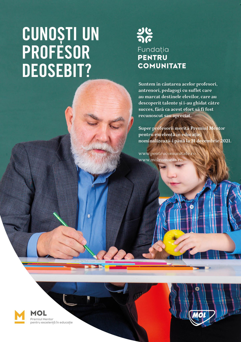 Sunt ultimele săptămâni în care se mai primesc nominalizări la Premiul Mentor pentru excelență în educație! Orice persoană poate să facă o nominalizare, atât în nume propriu, cât și în numele unui grup. Nominalizarea trebuie să conțină numele și datele persoanei nominalizate (adresa poștală, e-mail, telefon, numele instituției în care își desfășoară activitatea), o justificare care să conțină cele mai importante rezultate obținute de copiii și tinerii pregătiți de el, precum și momentele de vârf ale carierei sale; mai trebuie să conțină și coordonatele persoanei care face nominalizarea (numele, adresa poștală, e-mail, telefon), ca aceasta să poată fi contactată în caz de nevoie pentru informații suplimentare. Este important de menționat că nominalizarea trebuie să contureze atât calitățile profesionale, cât și pe cele umane ale persoanei propuse și să evidențieze rolul mentorului în viața și cariera discipolului. Sunt valabile doar nominalizările făcute pe formularul online accesibil pe site-ul Fundației (www.pentrucomunitate.ro). Nominalizările se pot face online, prin site-ul Fundației Pentru Comunitate, până la data de 31 decembrie 2021. Pot fi nominalizați profesori, antrenori, pedagogi care pregătesc, învață, educă, ajută copii și tineri cu vârste sub 18 ani, care organizează cercuri de specialitate, îndrumă activitatea extrașcolară a acestora, care sprijină cu devotament și cu eficiență lansarea lor pe drumul succesului, care sunt capabili să acorde o atenție sporită acelor copii sau tineri a căror situație familială sau materială i-ar defavoriza în cursa pentru succes, care au înființat unele foruri (competiții, întâlniri, cercuri, cluburi, asociații, etc.) cu un rol semnificativ în dezvoltarea tinerilor, în punerea în valoare a talentului lor, care prin calitățile lor umane și profesionale au câștigat de-a lungul unei cariere de mai multe decenii aprecierea comunității locale și a specialiștilor din domeniul lor de activitate. „Cunoașteți un profesor bine pregătit profesional, devotat, entuziast, care a susținut pregătirea școlară a copilului dumneavoastră, organizând cercuri de specialitate, susținându-l la concursuri, dându-i sfaturi utile pentru dezvoltarea talentului său? Cunoașteți un antrenor, care a descoperit talentul copilului dumneavoastră și care l-a ajutat să-şi dezvolte aptitudinile în domeniul sportiv cel mai potrivit pentru el? Vă mai amintiți un profesor, care v-a lansat în carieră și la care v-ați putut întoarce oricând pentru sfaturi și sprijin profesional? Ajutați-ne să-i găsim pe cei mai buni dintre acești profesori, antrenori, mentori! Dorim să atragem atenția opiniei publice asupra acelor profesori, antrenori, mentori care au descoperit și au lansat tinere talente, care le-au sprijinit din umbră primii pași, al căror devotament și entuziasm au contribuit esențial la dezvoltarea, punerea în valoare a talentelor lor. Îi căutăm pe acei profesori, antrenori, mentori care au reușit și reușesc să stimuleze copii talentați, care îi pregătesc pentru a face față competițiilor, care caută în permanență posibilitățile lor de dezvoltare. Îi căutăm pe acei profesori, antrenori, mentori a căror excelență educativă a condus generații întregi spre succes, a căror activitate însă a rămas în umbră, fără recompense morale sau materiale. Dacă îi cunoașteți, nominalizați-i la Premiul Mentor pentru excelență în educație” – acesta este îndemnul reprezentanților Fundației Pentru Comunitate.