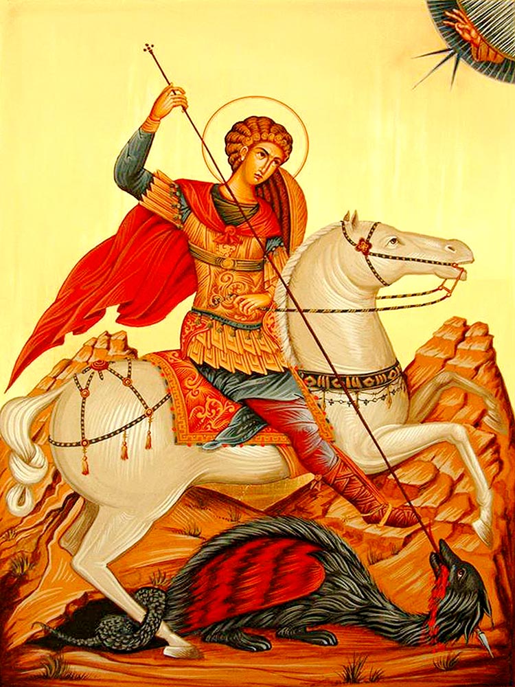 Astăzi, 23 aprilie 2024, sărbătorim Hramul bisericii noastre, «Sfântul Mare Mc. Gheorghe, purtătorul de biruinţă», cel născut în Capadocia şi numit «Purtătorul de biruinţă», deoarece, nu prin propriile sale puteri a ieşit biruitor în lupta cu tot ceea ce înseamnă răul! Acest sfânt, ne demonstrează că biruinţa vine de la Hristos Mântuitorul, şi că el doar şi-a însuşit-o ca un «vas» care poartă biruinţa! De aceea, vedem în icoana Sfântului Gheorghe, o persoană care a avut bărbăţia de a lupta cu demonul răului, nu numai pentru sine însuşi, ci pentru ceva mai mult decât propria sa persoană, ştiind bine că lupta aceasta îl poate costa viaţa. Sfântul Gheorghe este reprezentat prin icoana unui cavaler fără de frică ce luptă cu un dragon, iar în fiecare dintre noi se regăseşte o idee referitoare la semnificaţia simbolică a Dumnezeului Cel Atotputernic în lupta cu puterile întunericului, precum balaurul de pe icoană, cel gata să distrugă frumuseţea vieţii fără de moarte, mai ales că în fiecare dintre noi există măreţia şi dărnicia sufletului, specifice duhului superior cavaleresc, ce se poate ridica la luptă pentru tot ceea ce este curat, nobil şi măreţ! De dragul frumuseţii acestor virtuţi, în acelaşi timp, şi de dragul Domnului Iisus Hristos, Căruia îi aparţine frumuseţea aceasta, precum mireasa îi aparţine mirelui celui curat şi iubit, însuşi chipul Sfântului Gheorghe este chemarea adresată nouă tuturor, mai ales că demonul răului s-a răspândit pretutindeni în lume şi el nu numai că mărşăluieşte în jurul nostru, dar se ascunde şi în noi înşine, străduindu-se să distrugă frumuseţea şi integritatea fizică şi morală a fiinţei umane. De aceea, suntem chemaţi să luptăm cu el, pentru a-l învinge, de dragul Lui Dumnezeu şi de dragul oricărui om pe care răul îl otrăveşte şi îl distruge! Deci, să ne referim la prima minune făcută de Sfântul Gheorghe şi care se leagă de înălţarea altarului în care urma să fie pus trupul său, în pacea lui Dumnezeu, de către Andrei, cel care stătea într-o noapte întins în pat şi cugeta spunându-şi: «Am greşit începând această construcţie, mai ales că nu văd pe nimeni care să mă ajute; şi nu ştiu dacă pot s-o termin sau nu. Dacă nu o termin, oamenii vor râde de mine, spunând: Acest om a început să construiască şi nu a fost în stare să termine, aşa cum a spus Mântuitorul nostru, pentru ca în final, în ziua de praznic a Sfântului Gheorghe, Andrei a stat şi a mâncat, s-a bucurat împreună cu credincioşii pentru binecuvântarea pe care Domnul i-a dăruit-o, iar, în timpul praznicului s-a ridicat şi le-a vorbit acestora, spunându-le: „Pentru că Domnul a pus în inimile voastre gândul de a mă ajuta, fiecare să dea câte puţin, după putere, aşa ca noi să împlinim, neamul nostru, această binecuvântare de care Domnul ne-a socotit vrednici, şi să construim jertfelnicul Sfântului Gheorghe în cetatea noastră”, după care toţi i-au răspuns într-un glas, zicând: praznic pentru ei în numele Sfântului Gheorghe, şi a stat şi a mâncat tu ei şi s-a bucurat împreună cu ei pentru binecuvântarea pe care Domnul i-a dăruit-o. In timpul ospăţului, s-a ridicat şi le-a vorbit, spunându-le: „Pentru că Domnul a pus în inimile voastre gândul de a mă ajuta, fiecare să dea câte puţin, după putere, aşa ca noi să împlinim, neamul nostru, această binecuvântare de care Domnul ne-a socotit vrednici, şi să construim jertfelnicul Sfântului Gheorghe în cetatea noastră!”. Şi toţi i-au răspuns într-un glas, zicând: «Iţi spunem că vom face după puterea noastră şi, prin voinţa lui Dumnezeu, vom veni la tine şi ceea ce vom găsi fiecare, după putere, aceea îţi vom aduce!». Atunci, toţi, de la cel mai mic până la cel mai mare, au făcut astfel, fiecare după puteri, iar ei au numărat ce se adunase în numele Sfântului Gheorghe! După aceea, Andrei a sosit la locul unde urma să fie ridicat altarul în numele Sfântului Gheorghe şi au pus temelia în numele