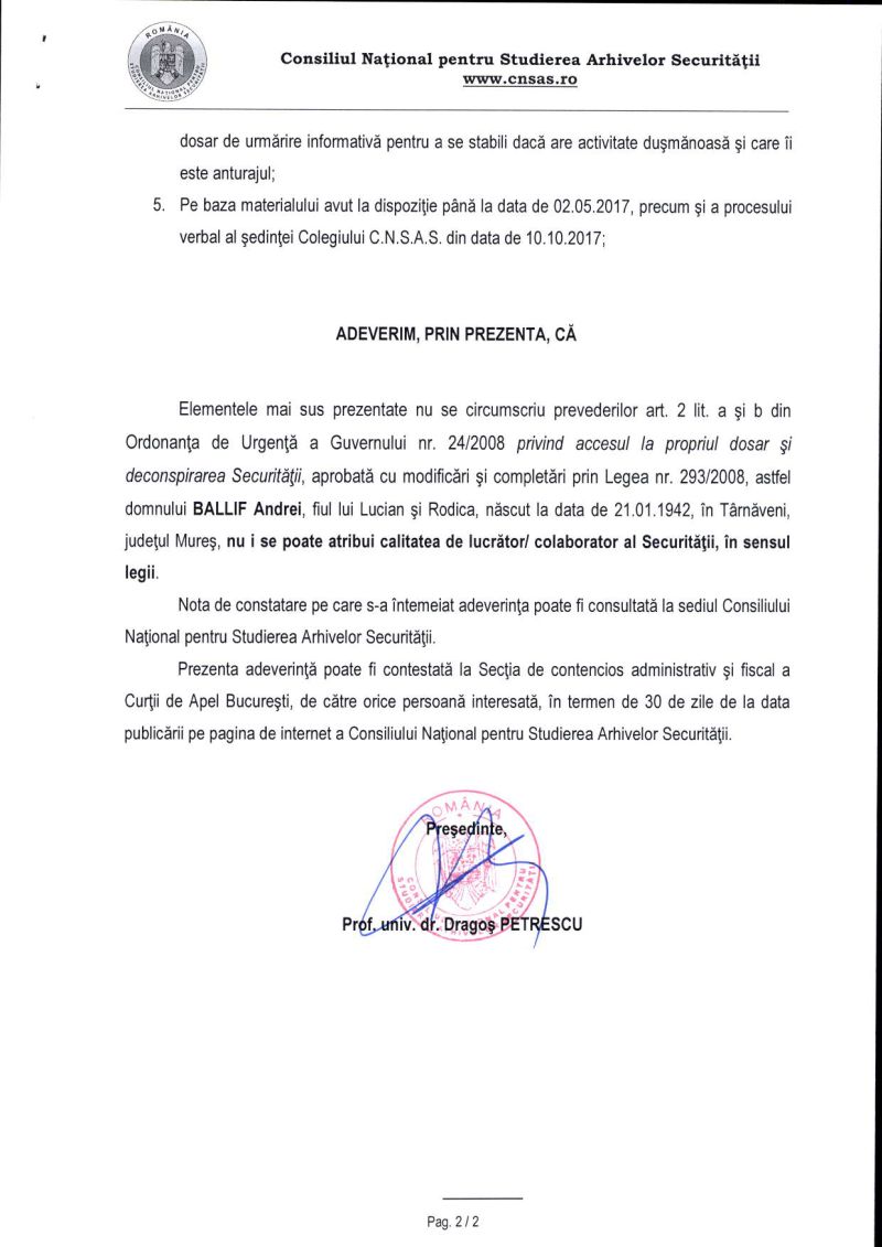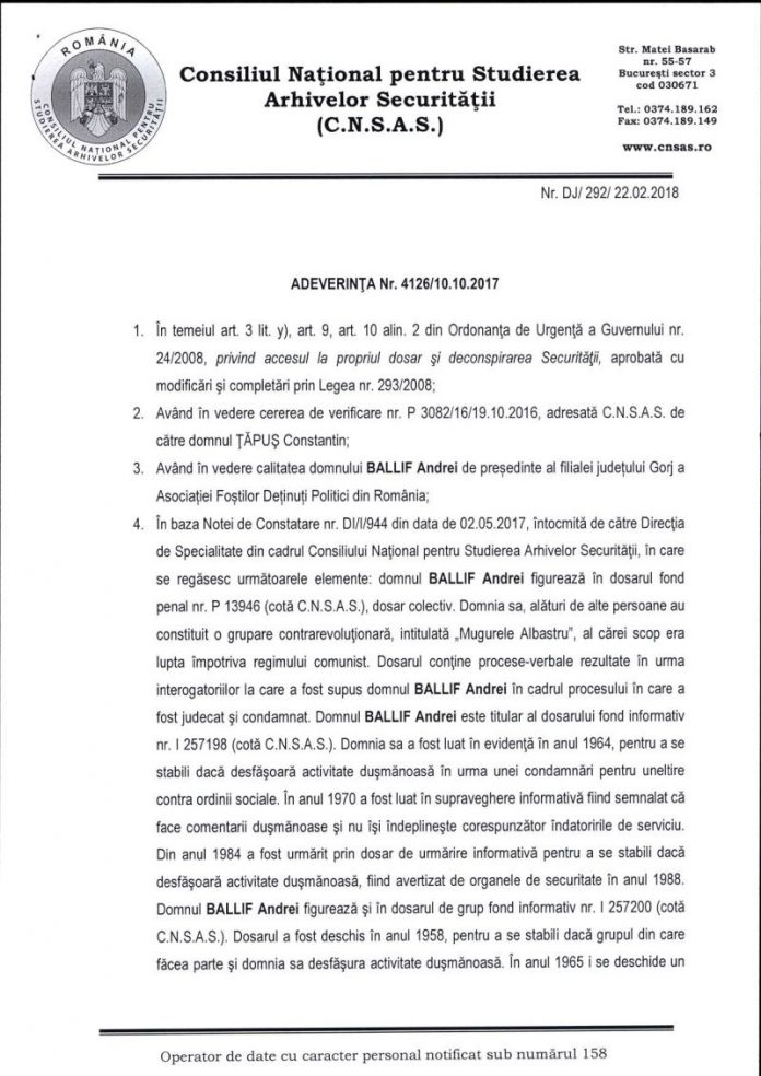 Andrei Balif, în vârstă de 75 de ani, președintele Asociației Foștilor Deținuți Politici din Târgu-Jiu, a decedat, luna trecută, în urma unor probleme de sănătate. Acesta a decedat acasă, fiind înmormântat în Cimitirul Municipal Târgu-Jiu. Membrii Asociației își exprimă regretul pentru trecerea în neființă a lui Andrei Balif.