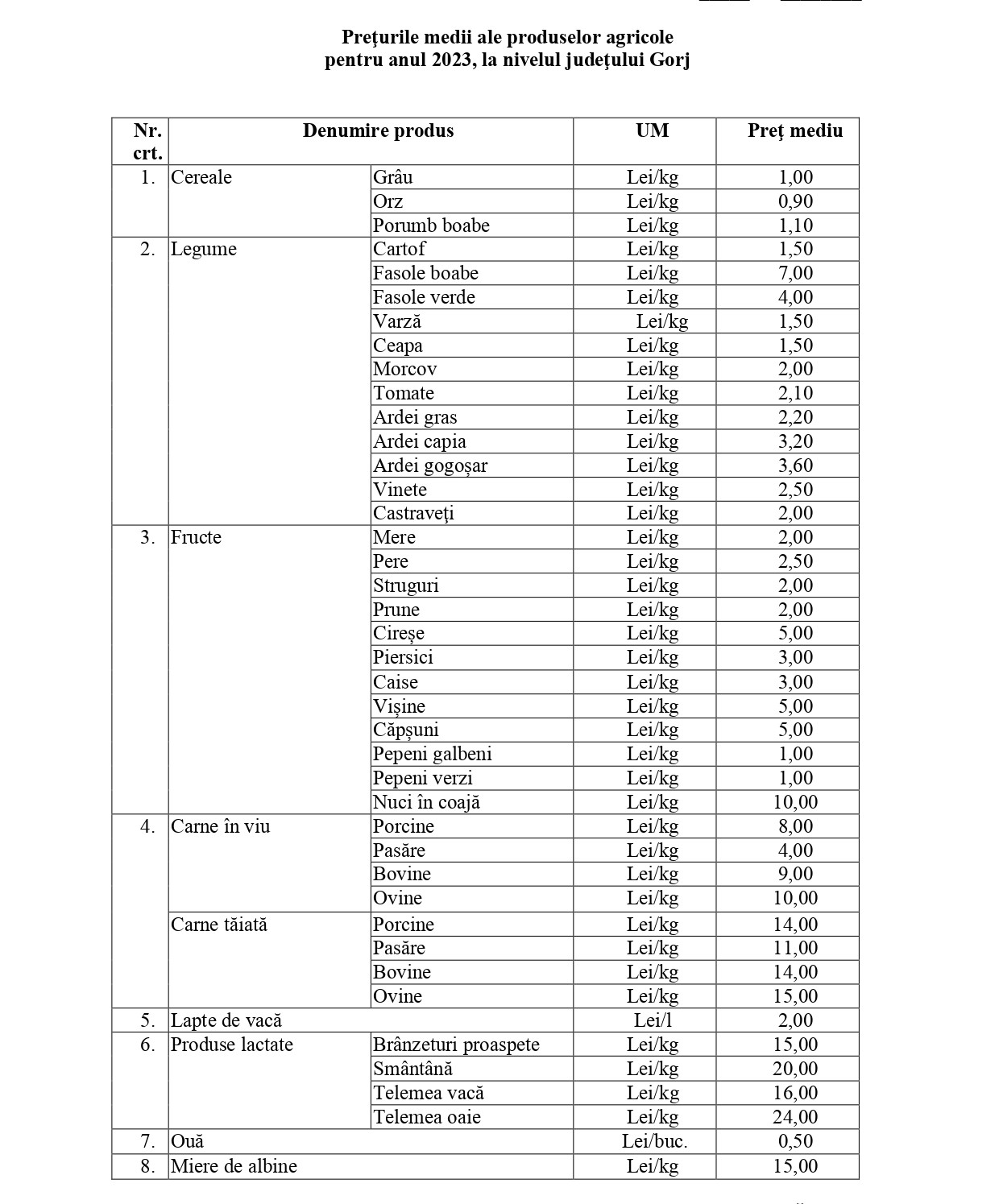 Consiliul Județean Gorj a stabilit prețurile medii la principalele produse agricole pe baza cărora se calculează veniturile din arendă în anul 2023.