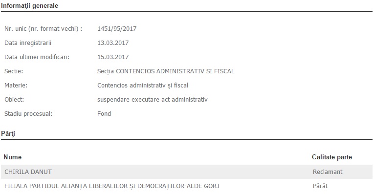 Nu numai Daniel Constantin, copreședintele ALDE, se pregătește să conteste în instanță legalitatea Delegaţiei Permanente a partidului, întrunită în vederea convocării congresului extraordinar al ALDE, ci a făcut-o, cu o săptămână în urmă, și un lider al alianței liberalilor și democraților de la Gorj. Dănuț Chirilă, prim-vicepreședinte al ALDE Gorj, provenit din aripa PC, cere la Tribunalul Gorj, prin două procese distincte, atât anularea actului administrativ respectiv, cât și suspendarea executării acestuia. Este de notorietate, de altfel, că Delegația Permanentă a ALDE Gorj, întrunită în februarie la Târgu-Jiu de către copreședintele Dian Popescu, a stârnit nemulțumiri în organizație, mai ales din partea foștilor conservatori.
