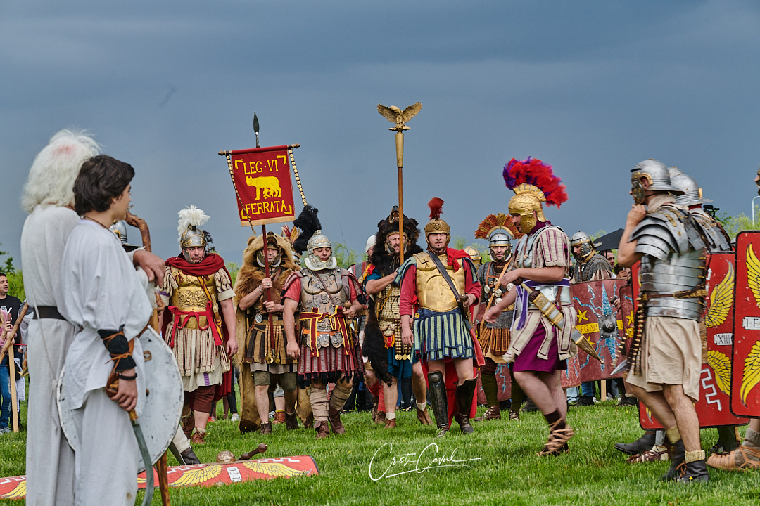Festivalul a început vineri seara, la ora 20:30, în Piața Prefecturii din Târgu Jiu, cu o impresionantă paradă cu torțe pe strada Victoriei și prezentarea celor mai importante asociații de reconstituire istorică din România, cu peste 160 de reenactori care vor da viață unor aspecte ale războaielor și civilizației daco-romane. Acestea au fost: Asociația pentru Istorie Vie din Alba Iulia alcătuită din voluntari albaiulieni, care au dat viața soldaților romani din Legiunea a XIII-a Gemina, războinicilor daci „Lupii Apoulonului”, gladiatorilor „Ludus Apulensis” și dansatoarelor antice „Magna Nemesis” și a devenit un important brand al municipiului Alba Iulia. Asociația Veteres Milites din Sibiu a dat viața soldaților romani din Legiunea a VI-a Ferrata, care în anul 106 e.n., cu o vexilaţie a legiunii, a participat la asediul Sarmisegetuzei Regia, capitala Daciei. Asociația „Historia Renascita” din Argeș a venit cu Legiunea a IV-a Flavia Felix și cu Daci liberi. Asociația „Terra Dacica Aterna” din Cluj-Napoca, cea mai veche asociație de reconstituire antică din România, a venit cu Daci liberi. Asociația „Romula Malva” din Dobrosloveni, județul Olt a venit cu Legiunea a VII-a Claudia Pia Fidelis iar din Moldova au venit „Carpii liberi”. Prezentarea a fost făcută de președintele Asociației „Historia Renascita” din Argeș, Cătălin Drăghici, artist plastic, ilustrator și profesor de istorie care a spus: „Cu parada din această seară a debutat prima