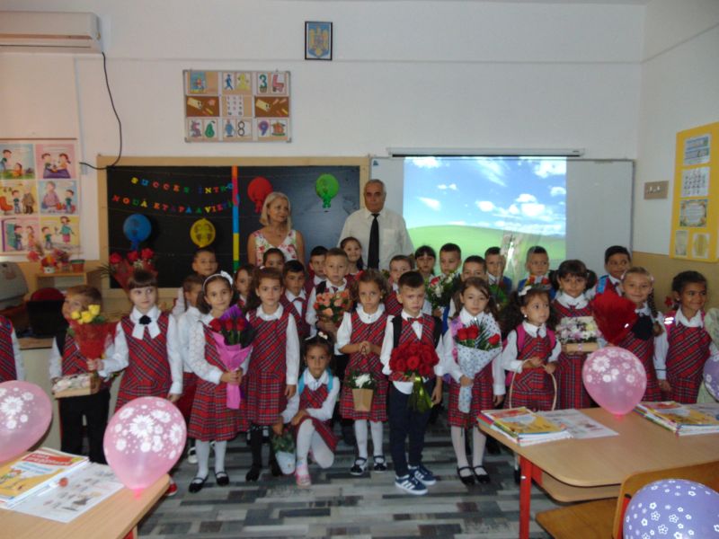 Ne urează bun venit la școală și face o scurtă prezentare a profilului școlii și rezultatelor obținute până acum de elevii foarte buni la învățătură. Ne anunță că anul acesta toți elevii vor învăța doar într-un singur schimb, numai dimineața. Nu ca până acum, pe două schimburi. Prezintă noii profesori veniți în școală anul acesta. Anunță că sunt două clase pregătitoare, A și B. Eu sunt repartizată la clasa A, unde este învățătoare doamna Vănușcă Elena. Ne adunăm ca puii de pasăre în jurul ei. Ne conduce, alături de părinți, în sala de clasă. Este la parterul școlii, pe partea de sud. Pășesc sfioasă, dar și curioasă în sala de clasă. Vai ce frumoasă este. Este asemănătoare cu cea de la grădiniță, dar mult mai mare și mai înflorată. Sunt două șiruri de măsuțe, spre perete și spre geam. Pe fiecare șir sunt câte cinci rânduri cu trei măsuțe fiecare. La fiecare măsuță este și câte un scaun micuț cu spătar. Pe fiecare masă este un balon și niște caiete cu coperți colorate și o acadea. Pe un perete este și rățoiul Donald. În fața clasei, sub stema României este o tablă neagră de scris pe ea și un ecran alb. Pe ecran este proiectată, cu ajutorul unui videoproiector o imagine cu un câmp înverzit sub un cer însorit. La catedră sunt și două pupitre metalice de comandă.