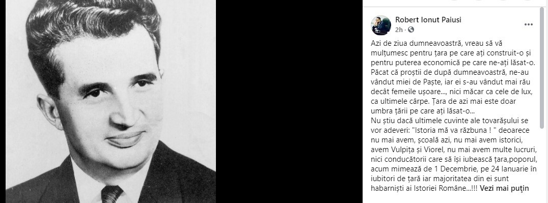 „Azi de ziua dumneavoastră, vreau să vă mulțumesc pentru țara pe care ați construit-o și pentru puterea economică pe care ne-ați lăsat-o. Păcat că proștii de după dumneavoastră, ne-au vândut miei de Paște, iar ei s-au vândut mai rău decât femeile ușoare…, nici măcar ca și cele de lux, ca ultimele cârpe. Țara de azi mai este doar umbra țării pe care ați lăsat-o… Nu știu dacă ultimele cuvinte ale tovarășului se vor adeveri: «Istoria mă va răzbuna!» deoarece nu mai avem școală azi, nu mai avem istorici, avem Vulpița și Viorel, nu mai avem multe lucruri, nici conducătorii care să își iubească țara, poporul, acum mimează de 1 Decembrie, pe 24 Ianuarie în iubitori de țară, iar majoritatea din ei sunt habarniști ai Istoriei Române…!!!”, a postat Păiuși.