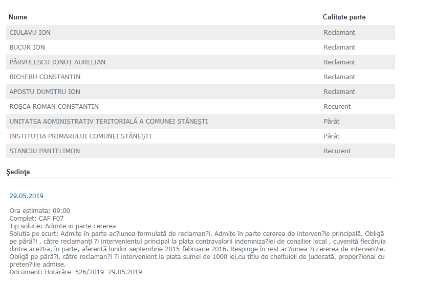Abia după ce s-a format un nou consiliu local, la sfârşitul lunii noiembrie 2016 s-a dat o hotărâre definitivă, la Craiova. A fost respins ca nul recursul Consiliului Local Stăneşti. Tardiv, însă. Dar nu şi pentru şapte consilieri locali, dintre care doar cinci mai sunt astăzi în funcţie. Ei au cerut în instanţă, în 2018, să fie plătiţi pentru perioada în care au participat la şedinţe şi nu au primit indemnizaţiile. La un an distanţă, s-a dat şi verdictul. „Admite în parte acţiunea formulată de reclamanţi. Admite în parte cererea de intervenţie principală. Obligă pe pârâţi, către reclamanţi şi intervenientul principal, la plata contravalorii indemnizaţiei de consilier local, cuvenită fiecăruia dintre aceştia, în parte, aferentă lunilor septembrie 2015 – februarie 2016. Respinge în rest acţiunea, și cererea de intervenţie. Obligă pe pârâţi, către reclamanţi şi intervenient la plata sumei de 1.000 lei, cu titlu de cheltuieli de judecată, proporţional cu pretenţiile admise”, a decis, pe 29 mai, Tribunalul Gorj. Cei cinci aleşi locali care vor primi indemnizaţiile restante sunt: Ion Ciulavu, Ion Bucur, Ionuţ Aurelian Pârvulescu, Constantin Bicheru şi Dumitru Apostu. Bani va primi şi fostul consilier Constantin Roman Roşca. „Noi am pus expert care să calculeze indemnizaţia pe perioada respectivă. Este vorba de 3.350 de lei, de fiecare, şase consilieri, şi mai este unul, dar care a lipsit mai mult timp de la şedinţe şi i-au respins. Am cerut doar indemnizaţia, ni s-a admis doar în parte acţiunea, pentru că a fost o perioadă de trei luni de zile care nu a fost luată în calcul”, mai spune Ciulavu.