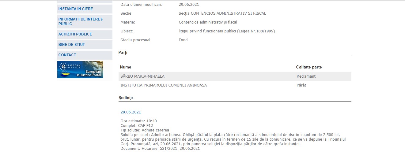 Instanța i-a admis cererea încă de la primul termen. „Admite acţiunea. Obligă pârâtul la plata către reclamantă a stimulentului de risc în cuantum de 2.500 lei, brut, lunar, pentru perioada stării de urgenţă. Cu recurs în termen de 15 zile de la comunicare, ce se va depune la Tribunalul Gorj. Pronunţată, azi, 29.06.2021, prin punerea soluţiei la dispoziţia părţilor de către grefa instanţei”, potrivit Tribunalului Gorj.