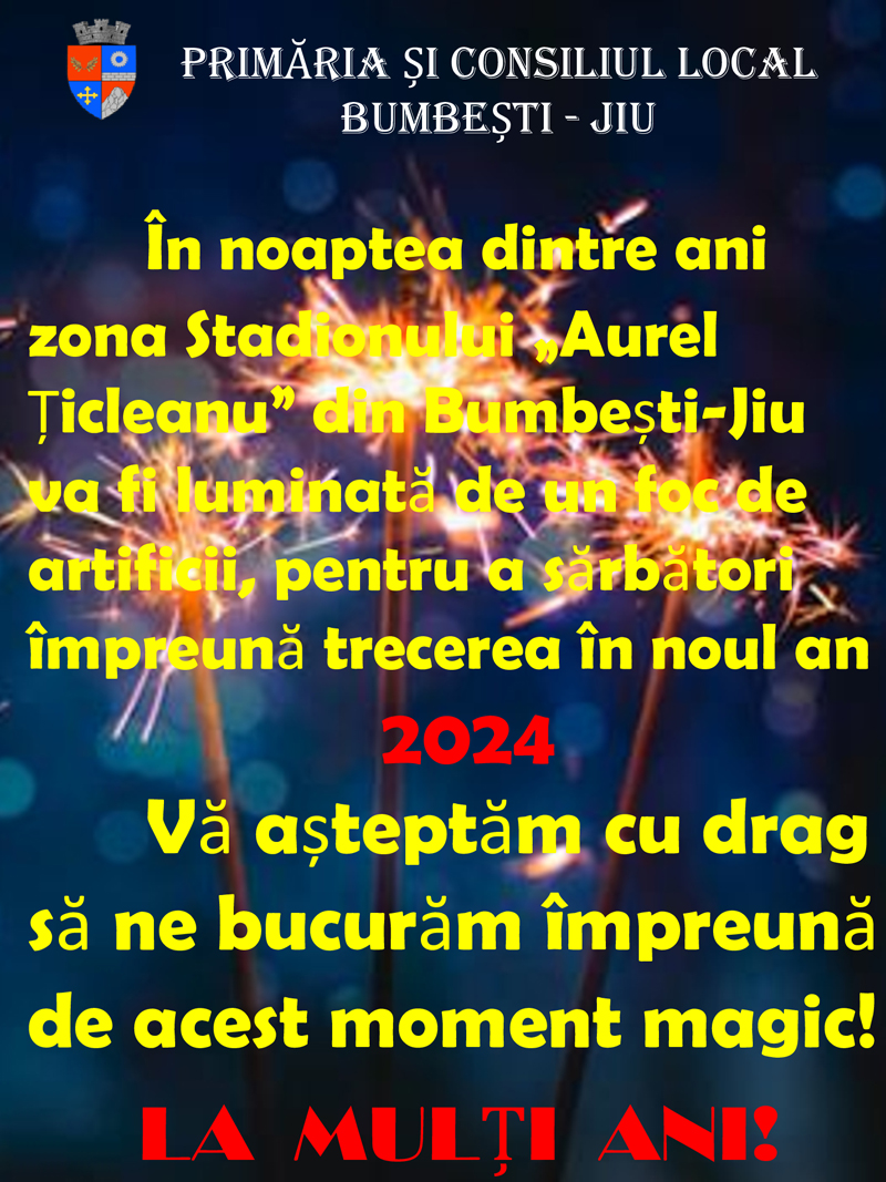 Și la Bumbești-Jiu, artificiile vor lumina cerul în noaptea de Revelion. ,,Vă așteptăm cu entuziasm la evenimentul special de Revelion, unde vom avea un foc de artificii impresionant care va ilumina cerul în noaptea magică a schimbării de an! Locație: Stadionul “Aurel Țicleanu” Bumbești-Jiu. Alăturați-vă comunității pentru a marca împreună începutul unei noi etape și pentru a crea amintiri de neuitat! Fiecare explozie colorată va fi o pledoarie pentru speranță, bucurie și reînnoire. Nu ratați ocazia de a experimenta magia Revelionului într-un cadru festiv, alături de cei dragi! Veniți în număr cât mai mare și să ne bucurăm împreună de acest moment deosebit”, au anunțat autoritățile locale.