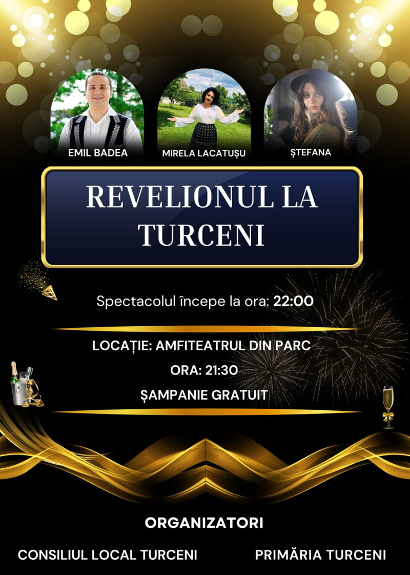 Autoritățile locale dau startul distracției duminică seară, de la ora 21:30, în zona amfiteatrului din parc. Pe scenă vor urca Emil Badea, Mirela Lăcătușu și Ștefana. De asemenea, Primăria Turceni promite a oferi în mod gratuit câte o cupă de șampanie tuturor cetățenilor care vor alege să petreacă Revelionul în aer liber, luând parte la manifestările organizate.