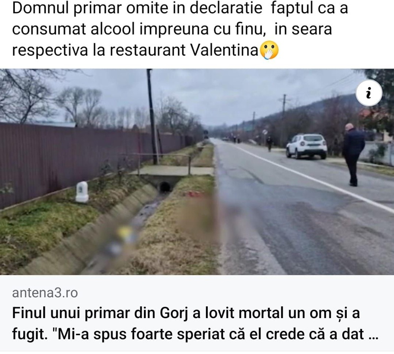 Finul primarului Sorin Bucurescu de la Slivilești a fost reținut sâmbătă, pentru comiterea unui accident rutier cu victimă și fugă de la locul accidentului. Evenimentul rutier s-a comis cu mașina primarului, nașul celui care și-a recunoscut sâmbătă după amiază abia ,,vina” în fața anchetatorilor, iar autoturismul avariat a fost parcat în curtea proprietarului care nu a reacționat la vestea că finul său a lovit cu mașina sa ,,ceva”. Povestea celor doi pare cusută cu ață albă, ca și petrecerea la care a participat doar finul, atâta timp cât ambii au fost văzuți în acea seară până după orele 00.00 consumând zeci de carafe de vin în Restaurantul Valentina din Motru. De altfel, sunt camere de luat vederi și la locația respectivă, și pe drumul din Motru spre Slivilești, care pot arăta că ambii au fost în autoturism, dar și faptul că unul este făptaș și altul este complice. Dacă victima era transportată la spital poate că scăpa cu viața, dar bărbatul a fost lăsat să agonizeze pe marginea drumului, în timp ce făptașul și complicii săi, băuți bine, s-au retras la domiciliu să se hidrateze.