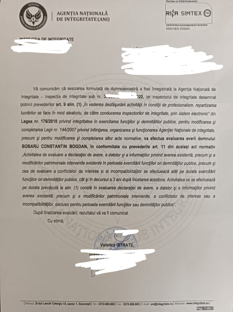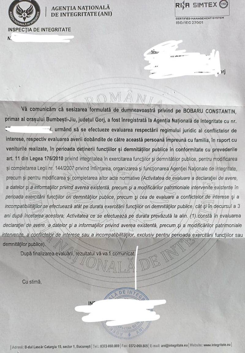 Urmare a declarațiilor de avere depuse în această vară, atât primarul PSD din Bumbești-Jiu, Constantin Bobaru, cât și contabila șefă a primăriei, Rîiosu Simona, dar și fiul edilului local, Bogdan Constantin Bobaru, au fost reclamați la ANI, iar Agenția Națională de Integritate a demarat o anchetă în cazul celor trei. Acest lucru a fost anunțat, oficial, de către ANI, prin adrese scrise, fapt care poate să atragă după sine, la finalul cercetării, nu doar constatarea unui incompatibilități ci și un dosar penal pentru cei trei. Reamintim că neconcordanțele din declarațiile de avere ale celor trei au fost prezentate de publicația Gorjeanul și de doi cetățeni din localitate.