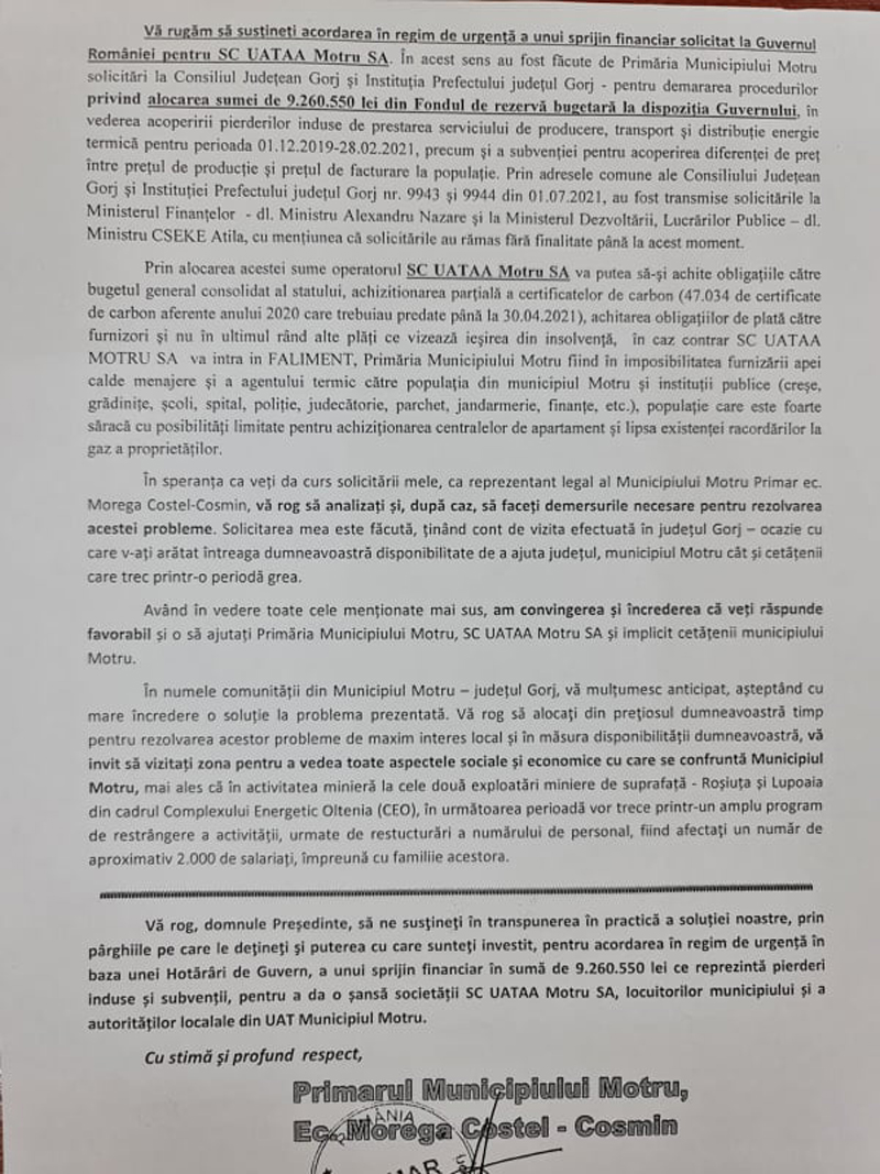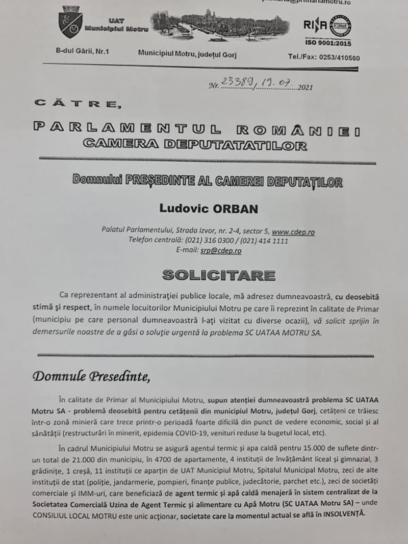 Problema nerezolvată a UATAA Motru l-a determinat pe edilul Cosmin Morega să îi scrie președintelui Camerei Deputaților, Ludovic Orban. Edilul solicită astfel sprijin liberalului, considerând că problema pe care o ridică este una de ordin comunitar, social și fără conotații politice. Primarul subliniază, în cuprinsul documentului, situația prin care trece orașul mineresc Motru, dar și posibilitatea ca uzina de alimentare cu apă să nu mai funcționeze, asta deoarece unitatea nu s-a conformat la normele de mediu, neachitând certificate de carbon impuse de lege.